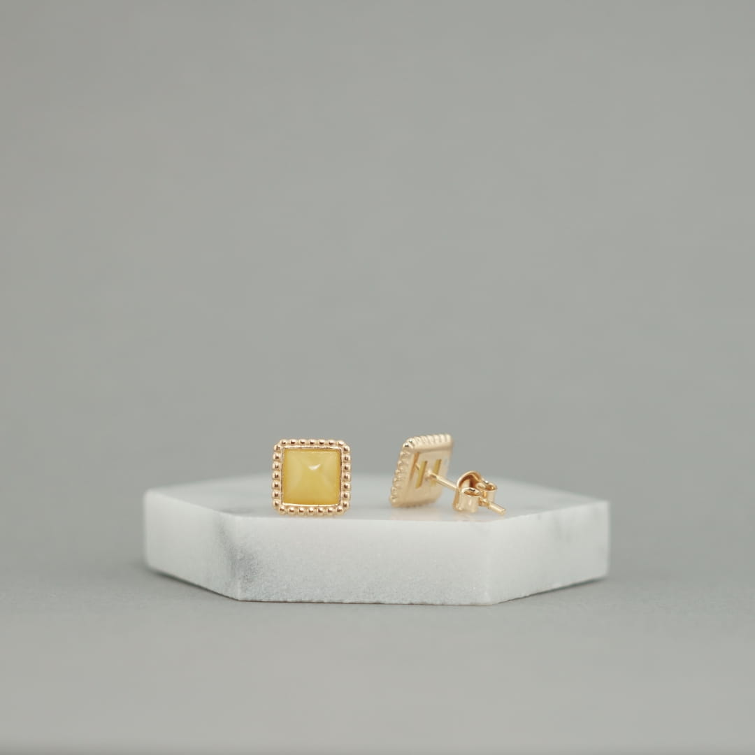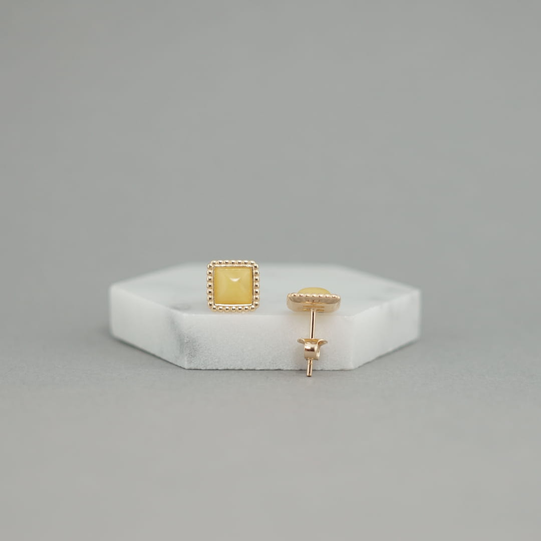 A pair of amber stone stud earrings is a top choice for everyday style. These square amber stud earrings are made out of natural Baltic amber and gold-plated sterling silver. Earrings are finished with a post and butterfly back.