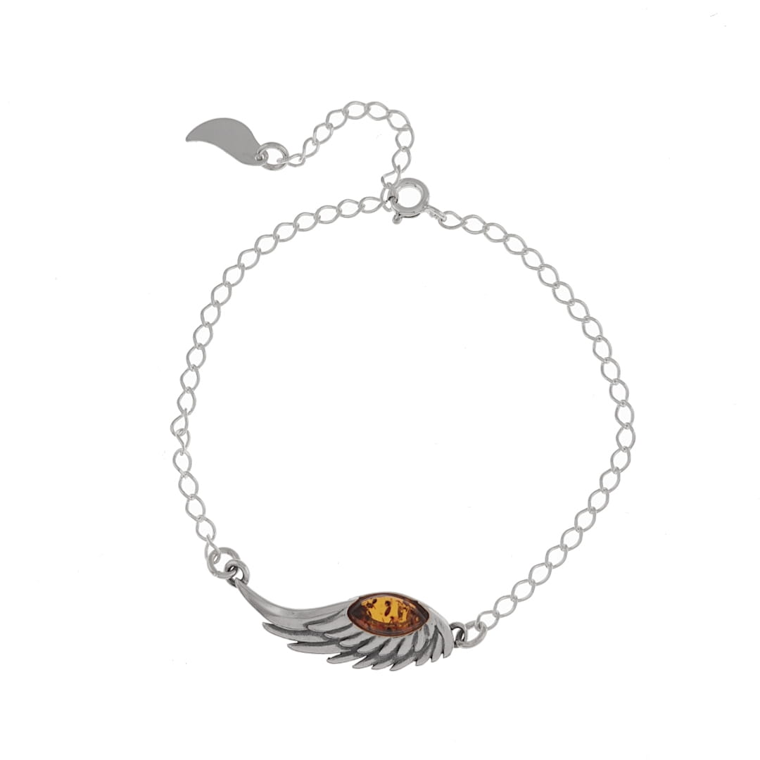 Delikatna bransoletka wykonana ze srebra próby 925 z bursztynem bałtyckim w kształcie soczewki. Rozmiar bransoletki można regulować, maksymalna długość to 21 cm.