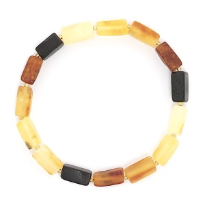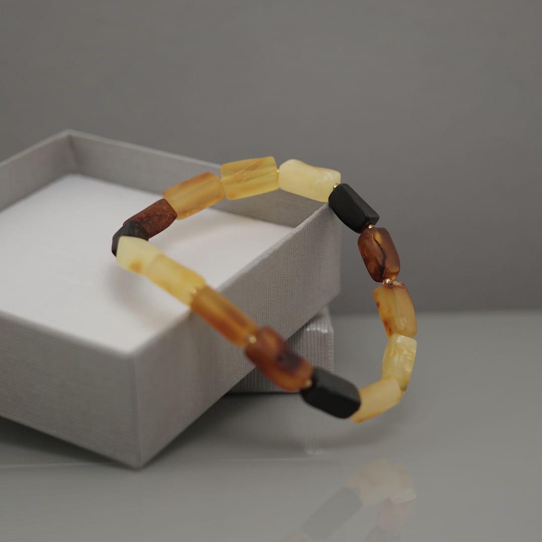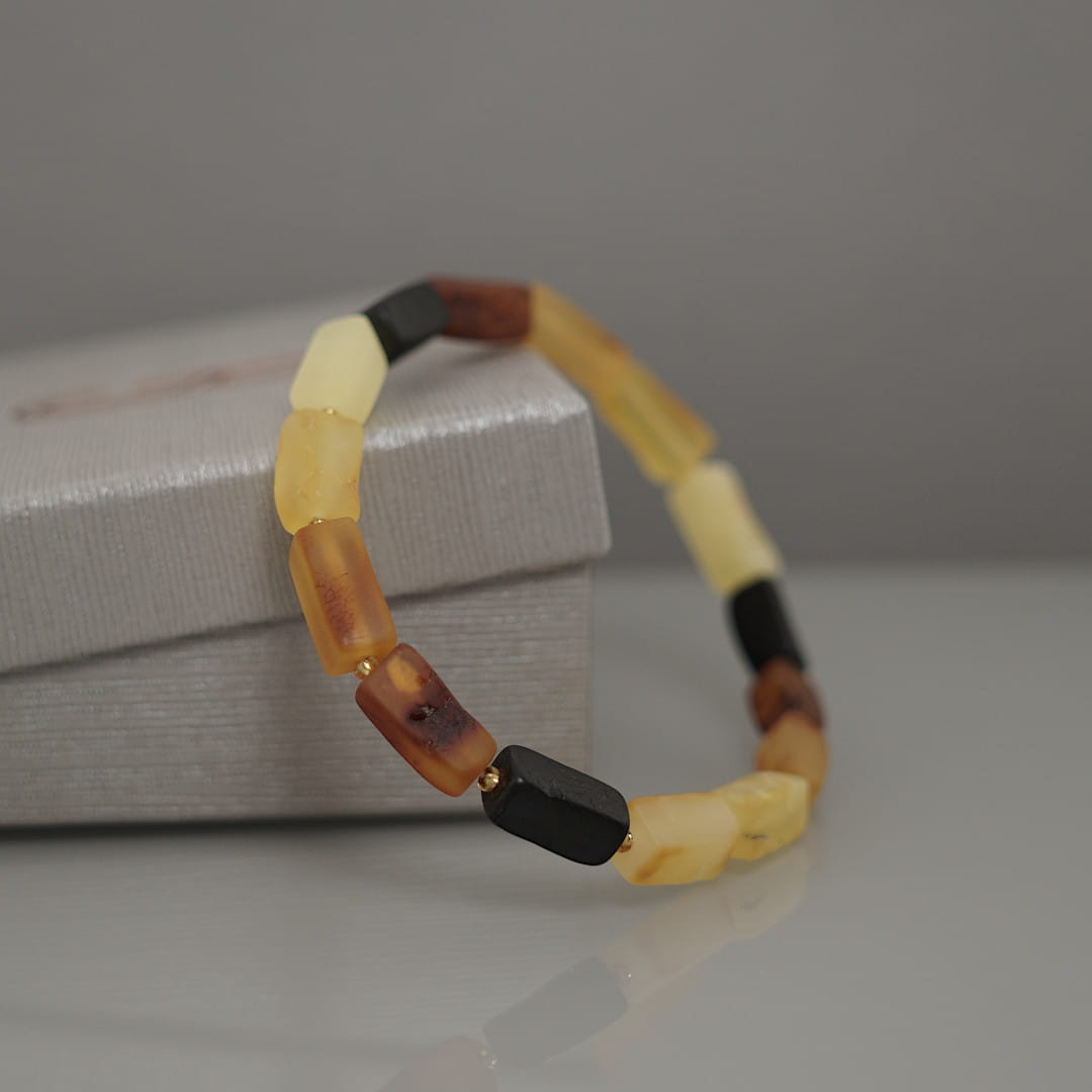 Ta bransoletka unisex, wykonana z naturalnych, matowych sześcianów bursztynu bałtyckiego, prezentuje stopniowe cieniowanie kolorów – od mlecznego do wiśniowego.