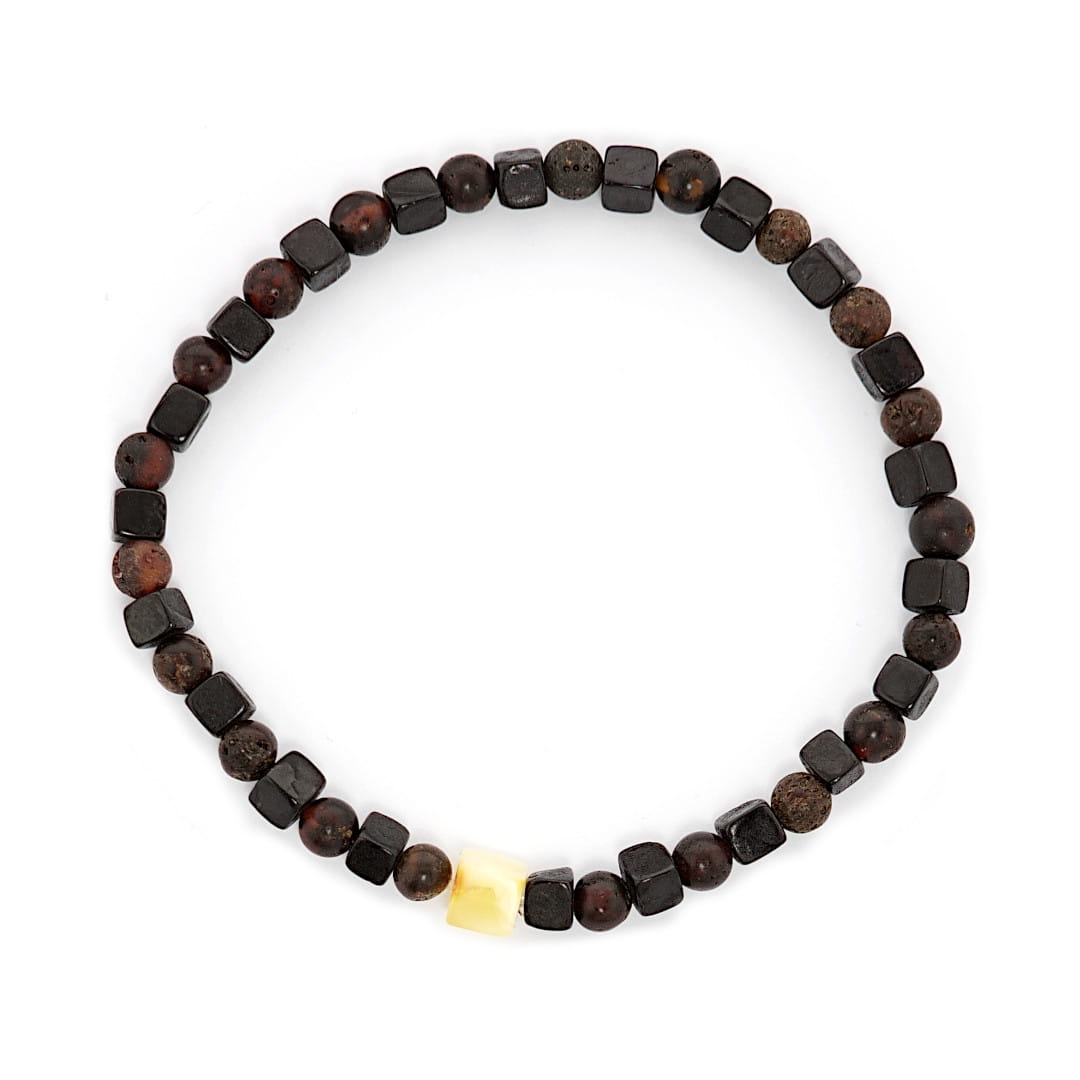 Odkryj subtelność i letni blask tej bransoletki, łączącej bursztynowe kuleczki i sześciany w kolorze ciemnej czekolady z akcentem w postaci mlecznego sześcianu bursztynu. Ten jasny element nadaje bransoletce świeżości i rozświetla jej ciemną barwę.