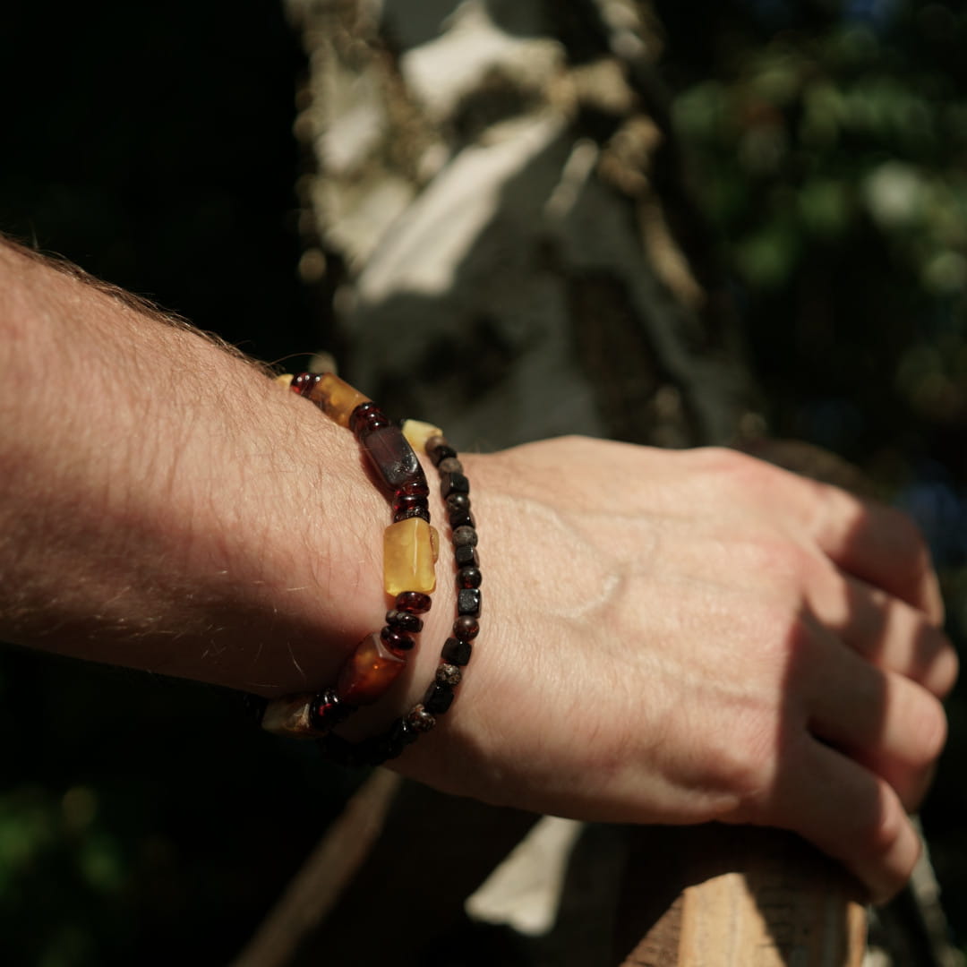 Intensywny, ciemny odcień bursztynu wynika z dużej ilości naturalnych zanieczyszczeń, co podkreśla jego autentyczność i unikatowy charakter. Możesz nosić ją samodzielnie jako dyskretny dodatek lub połączyć z innymi bransoletkami, tworząc prawdziwie letnią kompozycję.