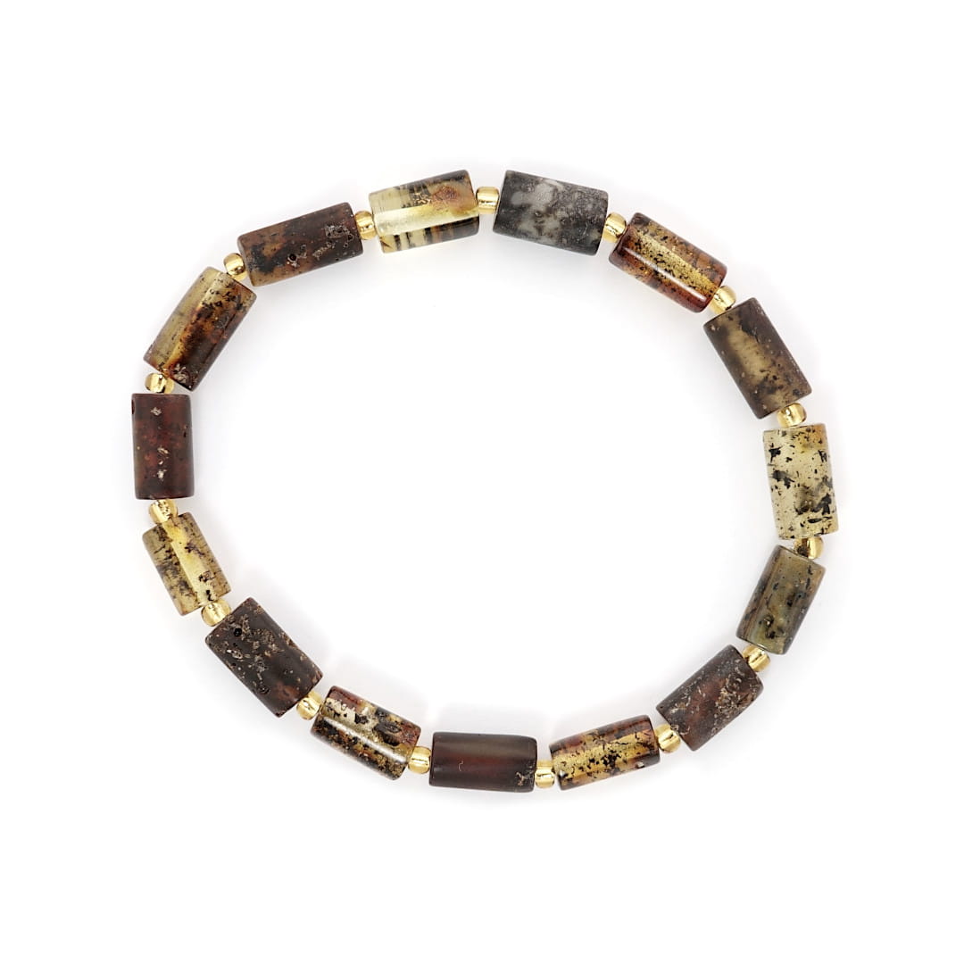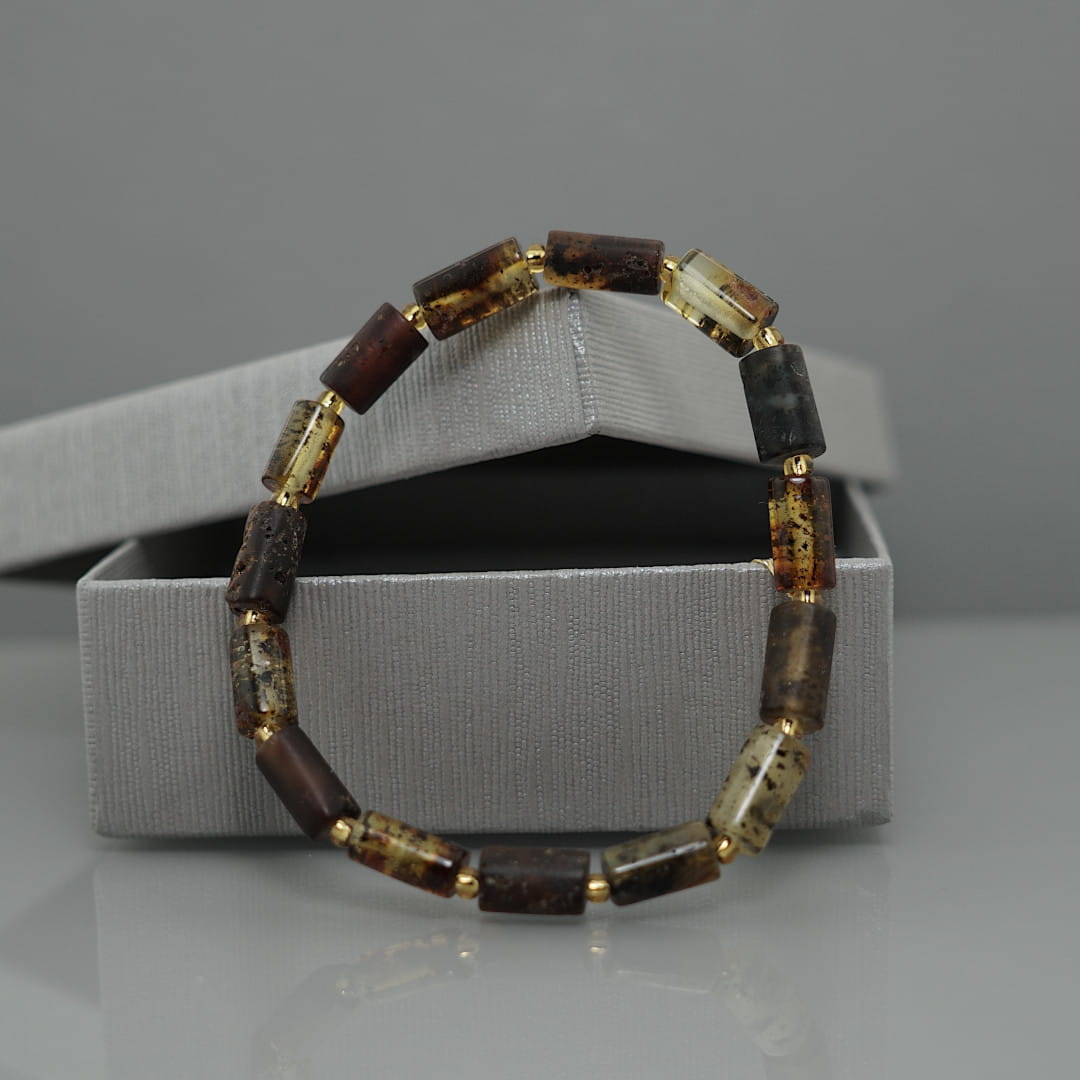 Bransoletka wykonany z naturalnego bursztynu bałtyckiego oszlifowanego w kształcie wałków. Bursztynowe elementy przetykane są bardzo drobnymi syntetycznymi koralikami zastępującymi węzełki, które sprawiają, że bransoletka bardzo dobrze układa się na nadgarstku. Bursztyny są w odcieniu cytrynowym z widocznymi naturalnymi zanieczyszczeniami. Do zrobienia bransoletki został wykorzystany tylko naturalny bursztyn, niepoddawany obróbce termicznej.