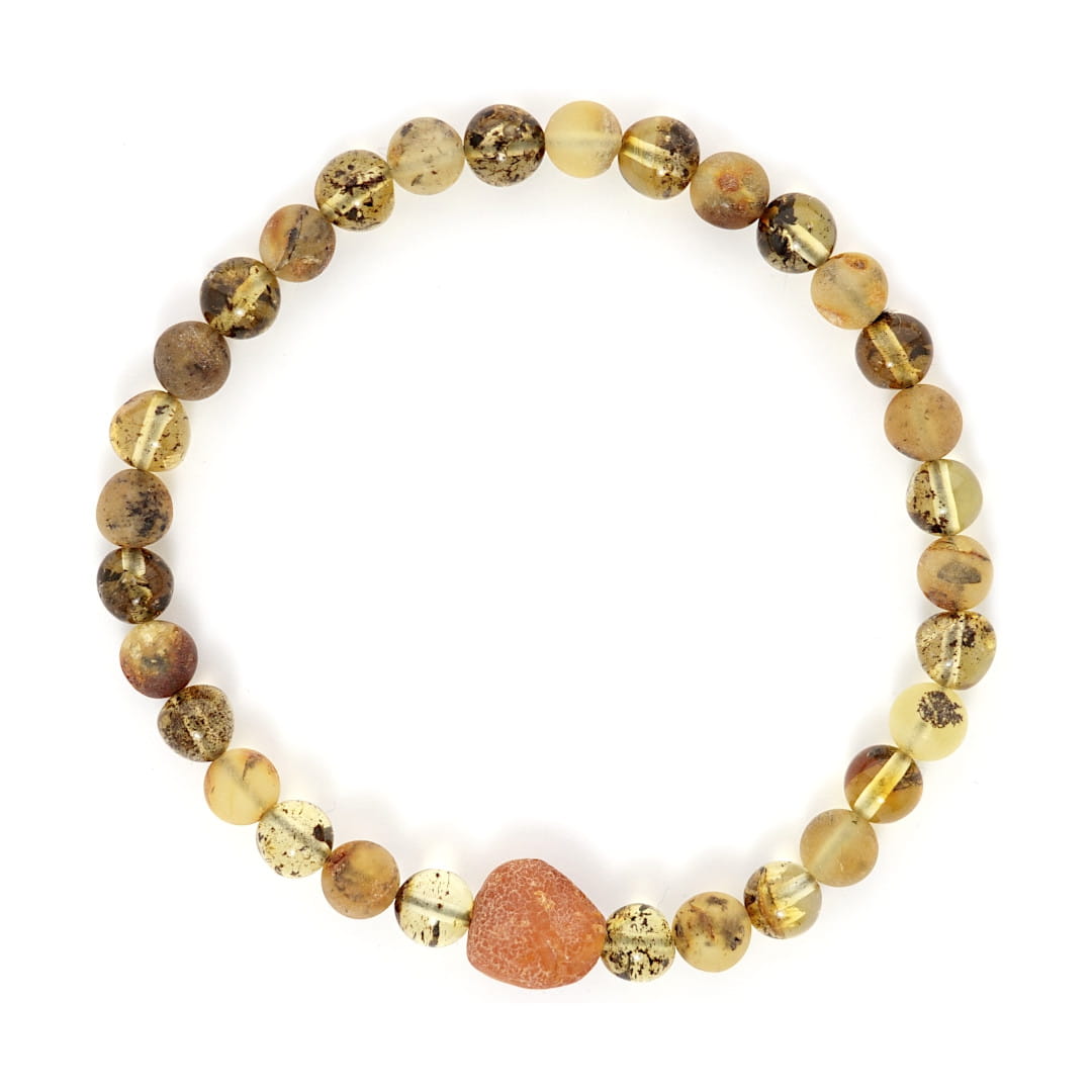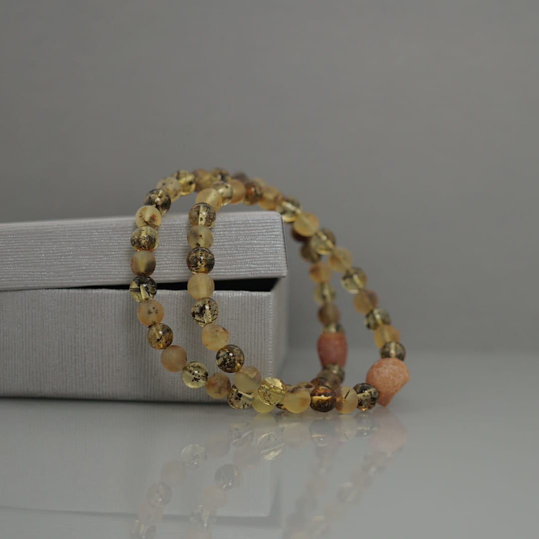 Bransoletka została wykonana z kulek naturalnego bursztynu bałtyckiego. Na trwałą gumkę jubilerską zostały nawleczone naprzemiennie kulki matowe i polerowane w kolorze cytrynowym. Dodatkowym elementem ozdobnym bransoletki jest bryłka surowego bursztynu.
