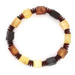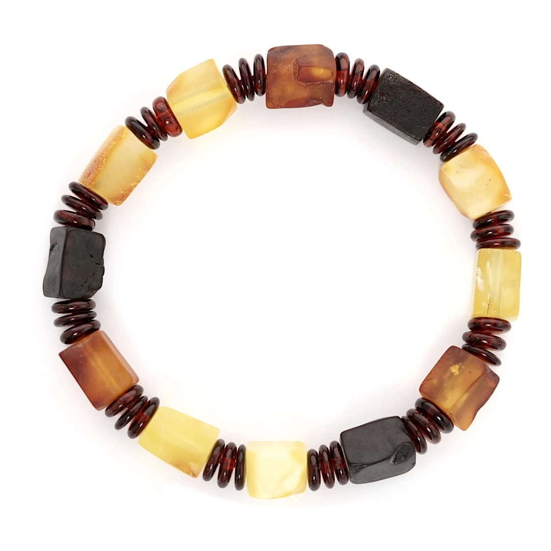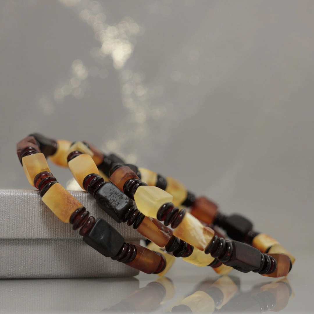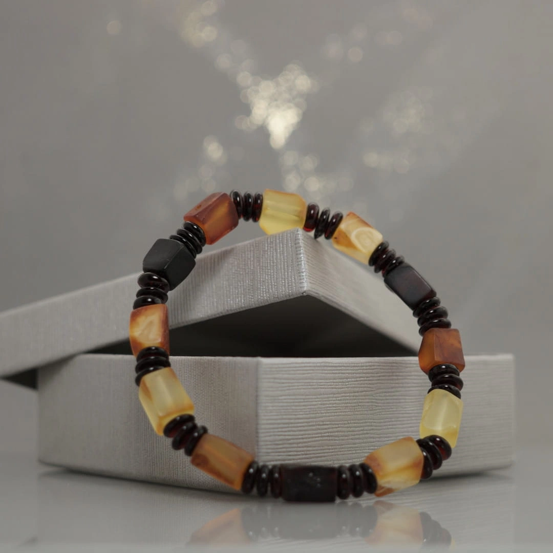 Odkryj piękno i oryginalność w tej męskiej bransoletce, stworzonej z naturalnych kawałków bursztynu bałtyckiego. Bransoletka łączy w sobie unikatowe sześciany bursztynu, które zachowały swoje naturalne pęknięcia i inkluzje, z drobnymi, okrągłymi bursztynowymi dyskami.