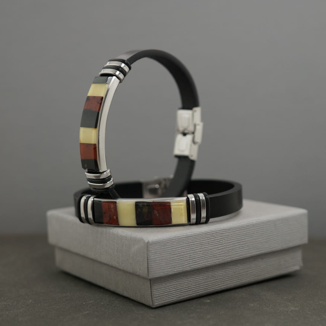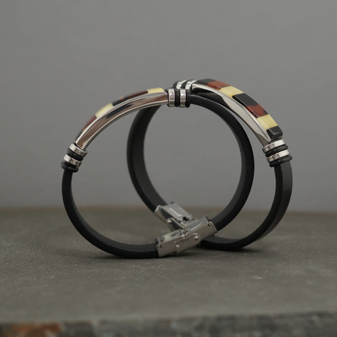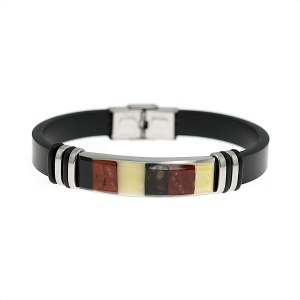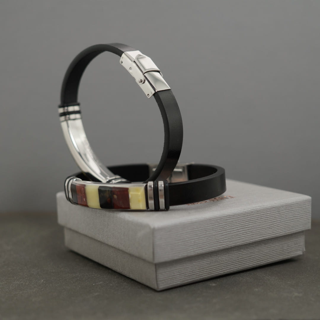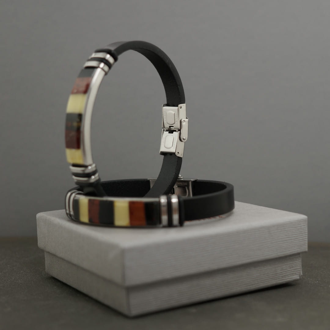 Męska bransoletka wykonana ze skóry oraz stali szlachetnej, ozdobiona mozaika z bursztynu bałtyckiego.