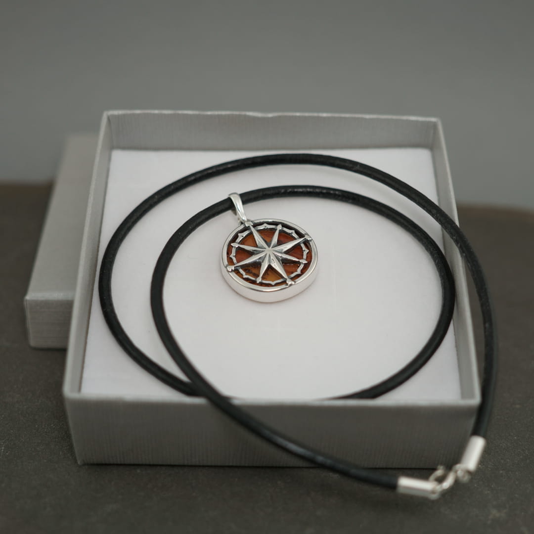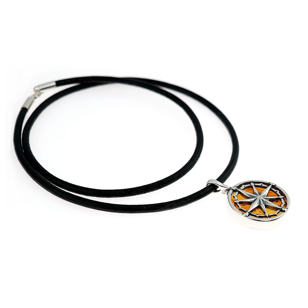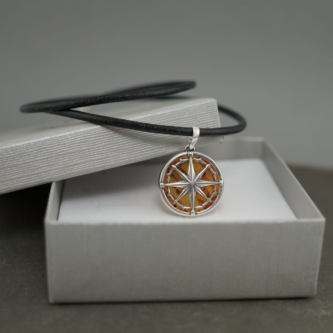 Wisiorek typu unisex wykonany ze srebra próby 925 oraz krążka bursztynu bałtyckiego, połączony z rzemieniem o grubości 2 mm. Oksydowane wykończenie srebra sprawia, że detale są bardziej widoczne i przyciągają wzrok.