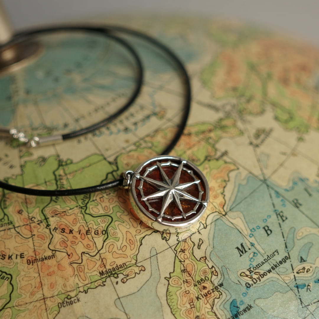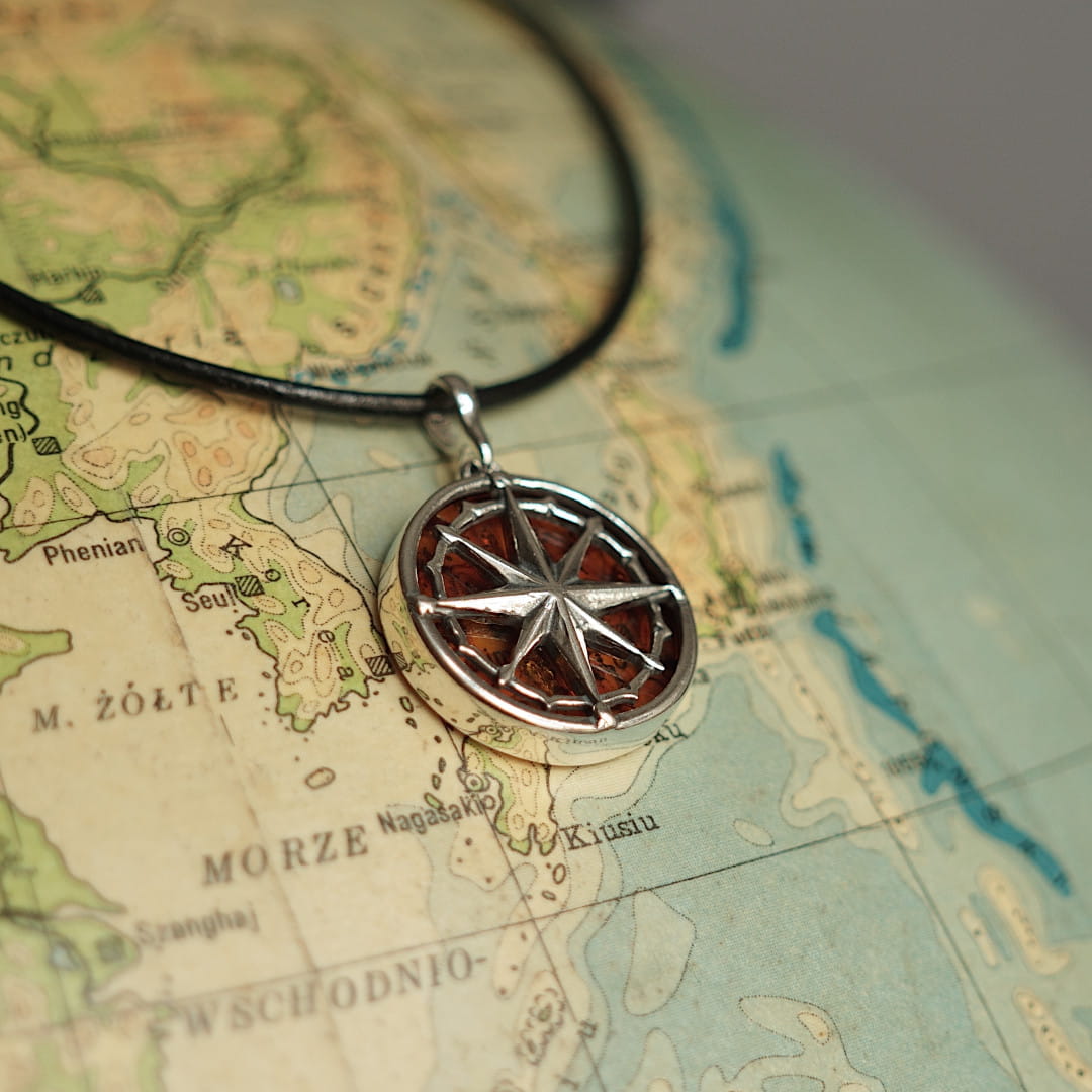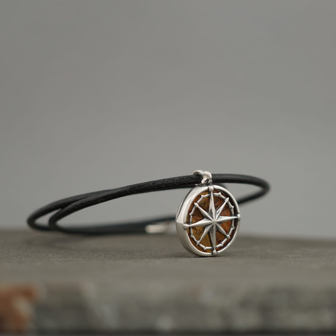 Wisiorek typu unisex wykonany ze srebra próby 925 oraz krążka bursztynu bałtyckiego, połączony z rzemieniem o grubości 2 mm. Oksydowane wykończenie srebra sprawia, że detale są bardziej widoczne i przyciągają wzrok.