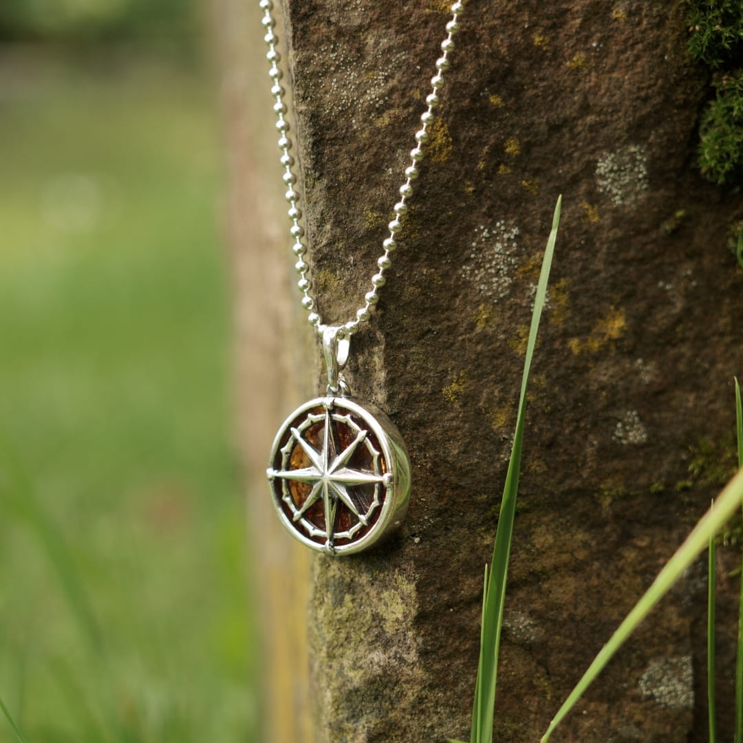 Naszyjnik róża wiatrów z bursztynem