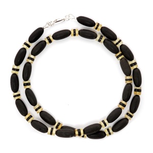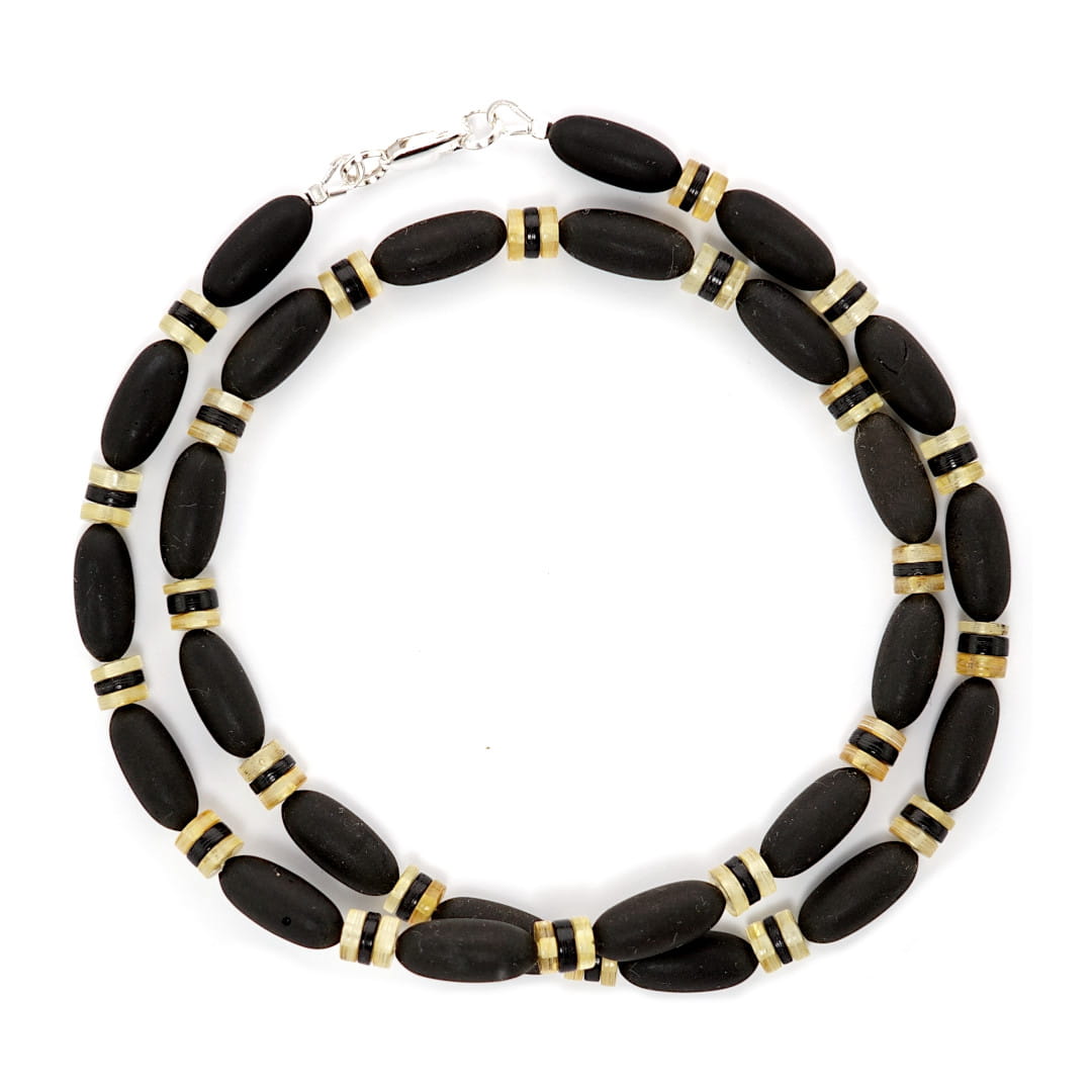 Naszyjnik jest wykonany z matowych bursztynowych koralików o cylindrycznym kształcie oraz polerowanych bursztynowych pastylek. Większkość elementów naszyjnika jest w kolorze ciemnej wiśni, elementem rozjaśniajacym jest bursztyn w kolorze cytrynowym.