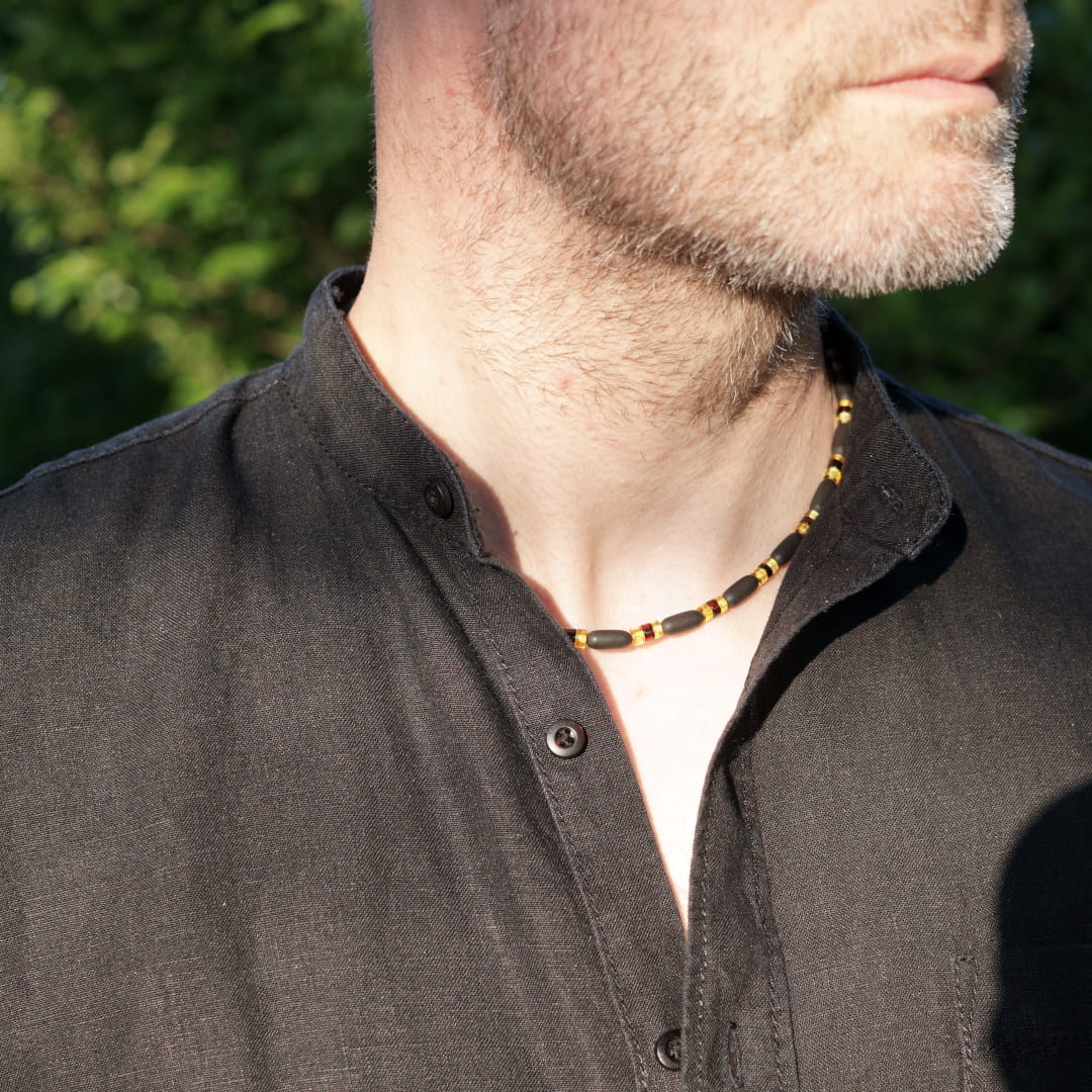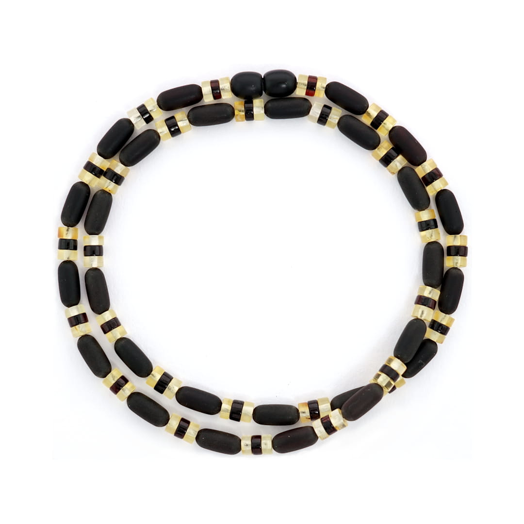 Naszyjnik jest wykonany z matowych bursztynowych koralików o cylindrycznym kształcie oraz polerowanych bursztynowych pastylek. Większkość elementów naszyjnika jest w kolorze ciemnej wiśni, elementem rozjaśniajacym jest bursztyn w kolorze cytrynowym.
