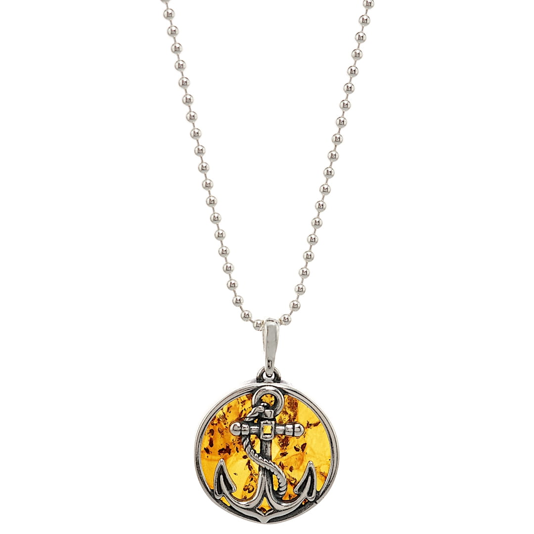 Wisiorek typu unisex wykonany ze srebra próby 925 oraz krążka bursztynu bałtyckiego. Srebrne elementy wisiorka są lekko oksydowane aby podkreślić i uwydatnić detale. Wisiorek zawieszony jest na łańcuszku kulkowym o grubości 2 mm.