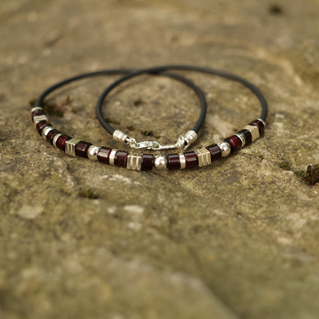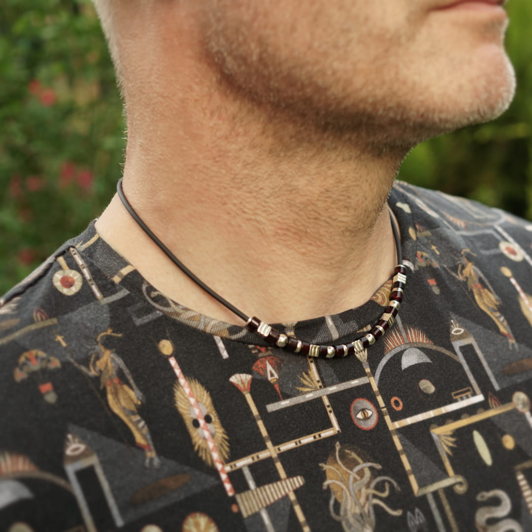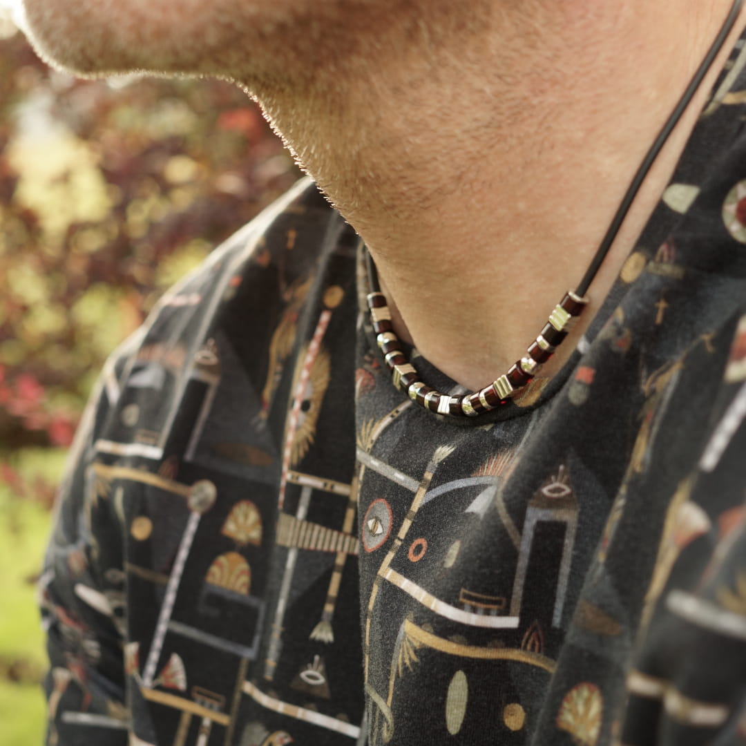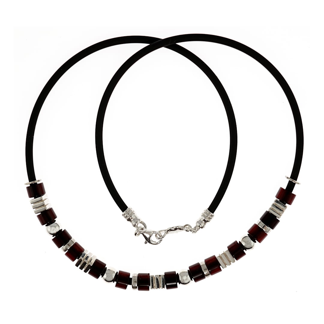 Elementy ze srebra próby 925 w połaczeniu z ciemnym wiśniowym bursztynem tworzą casualowy męski naszyjnik, uniwersalny i ponadczasowy.