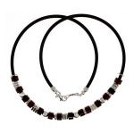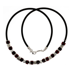 Naszyjnik został wykonany z wałeczków bursztynu w kolorze wiśniowym oraz srebrnych elementów nawleczonych na kauczukową obrożę.