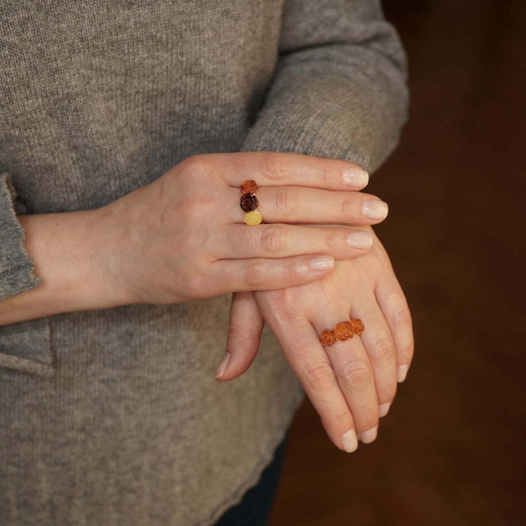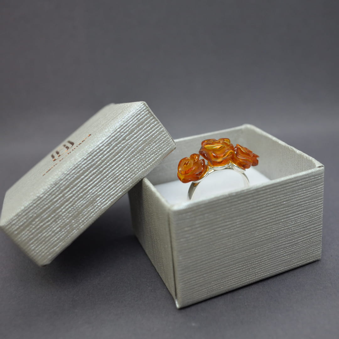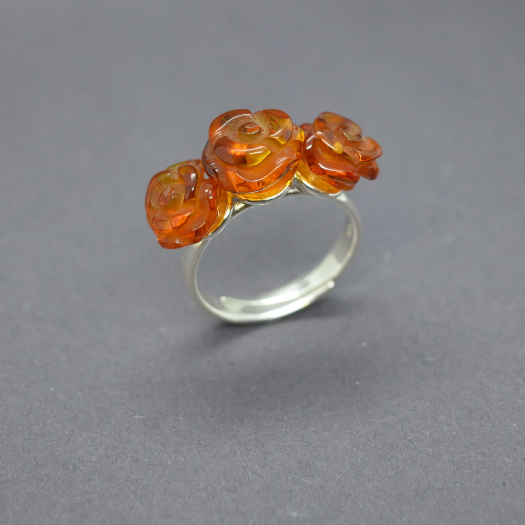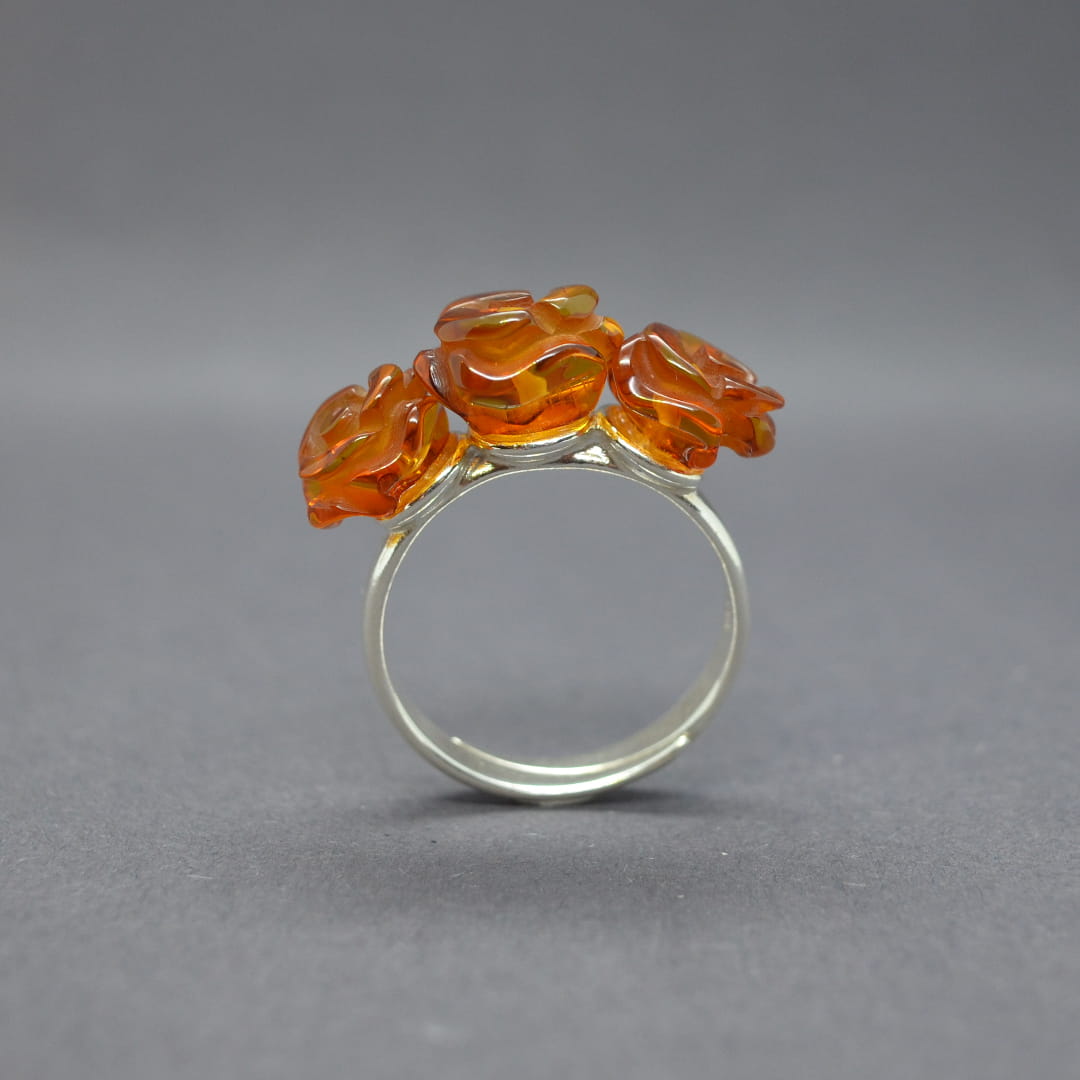 Niepowtarzalny ręcznie wykonany pierścionek z trzema bursztynowymi różyczkami. Pąki róż zostały starannie wyrzeźbione z koniakowego bursztynu i osadzone na srebrnym sztyfcie i srebrnej obrączce. Obrączka posiada dużą regulację rozmiaru od 15 do 18.