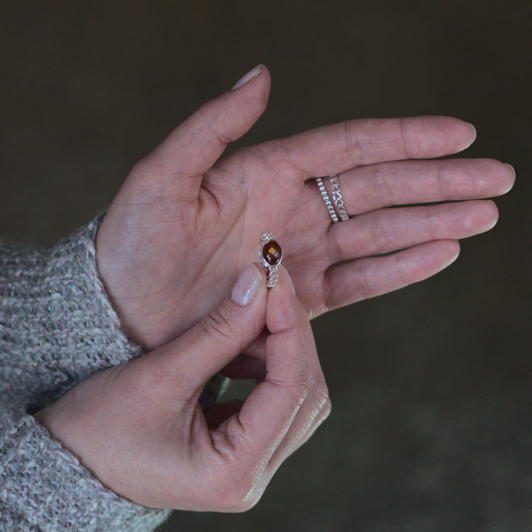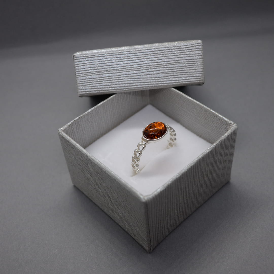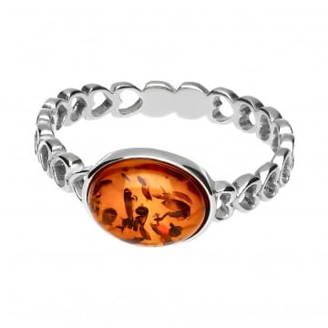 Delikatny pierścionek z bursztynowym oczkiem osadzonym na ażurowej obrączce. Wykonany ze srebra próby 925, ozdobiony bursztynem bałtyckim w tradycyjnym koniakowym kolorze.