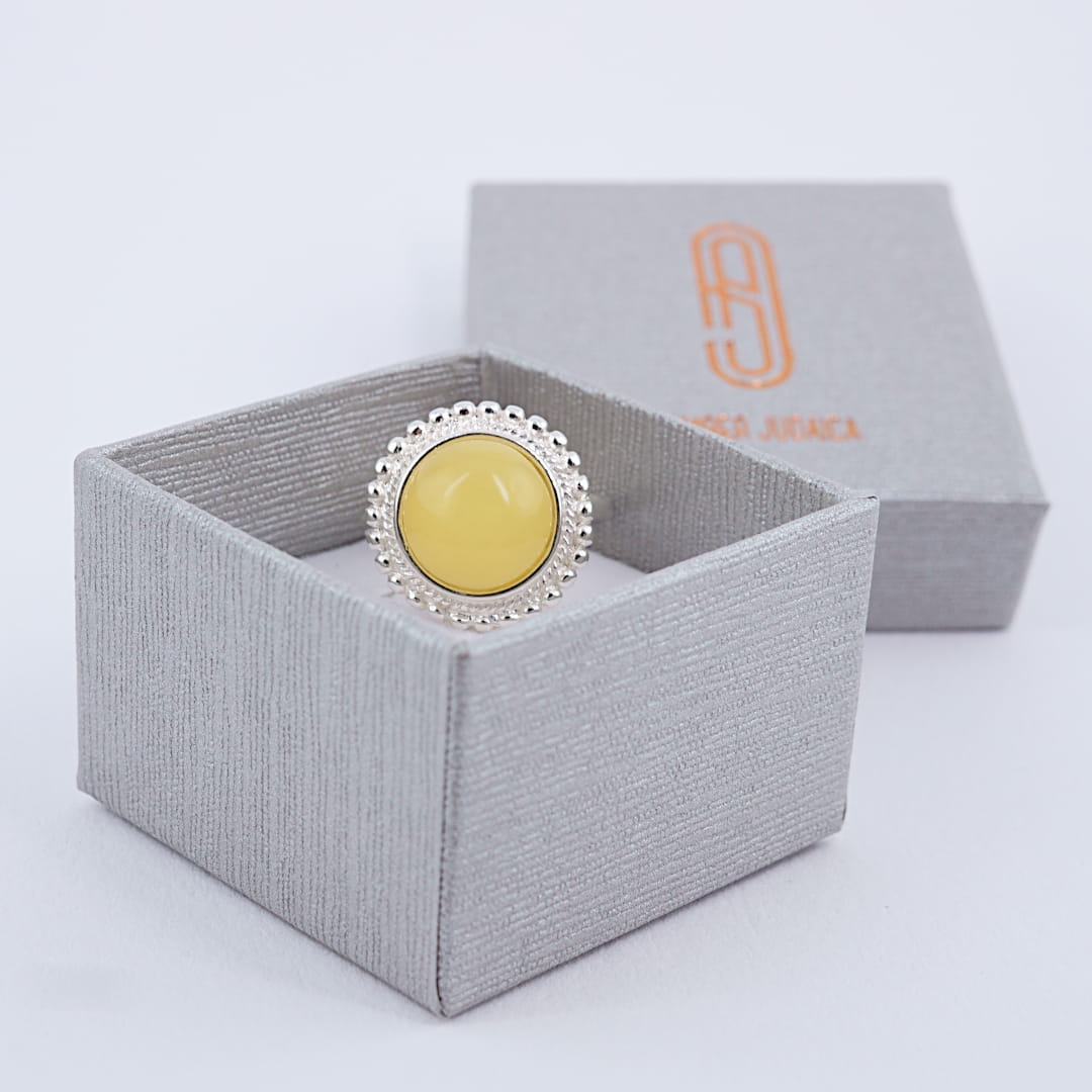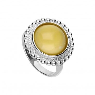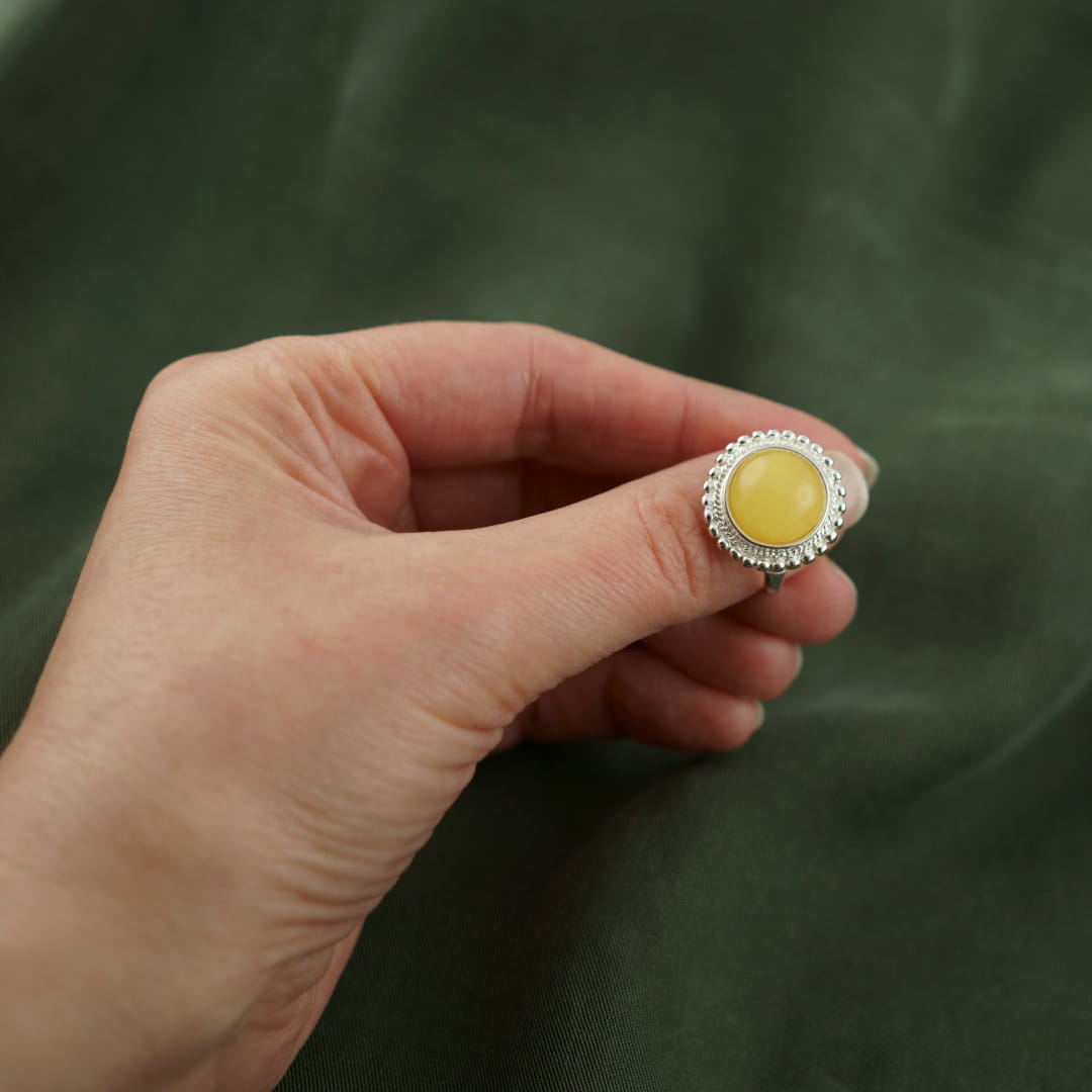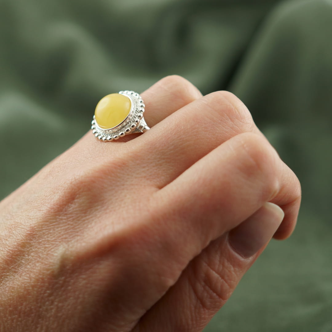 Pierścionek z bursztynem w klasycznej eleganckiej oprawie, wykonany ze srebra próby 925. Matowe srebro pięknie kontrastuje z mlecznym odcieniem bursztynu.