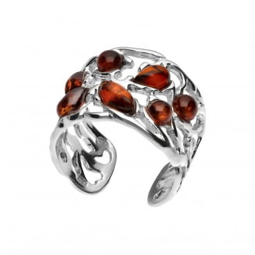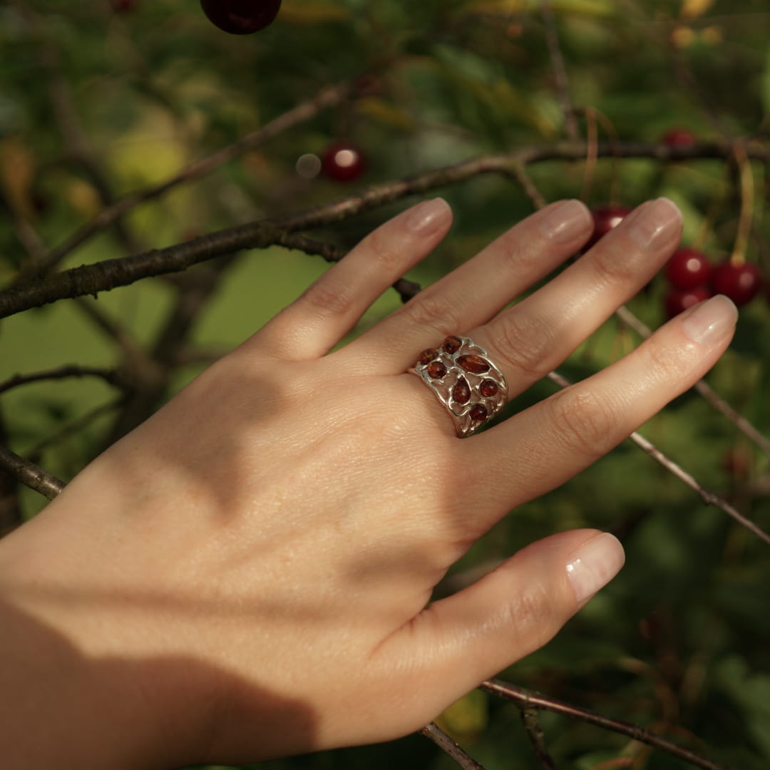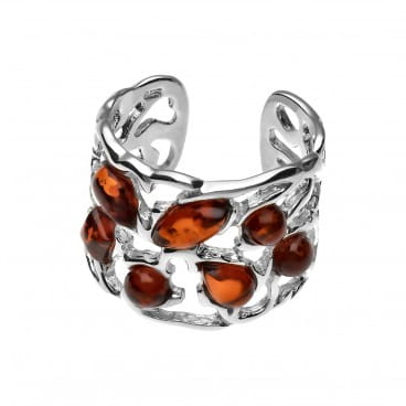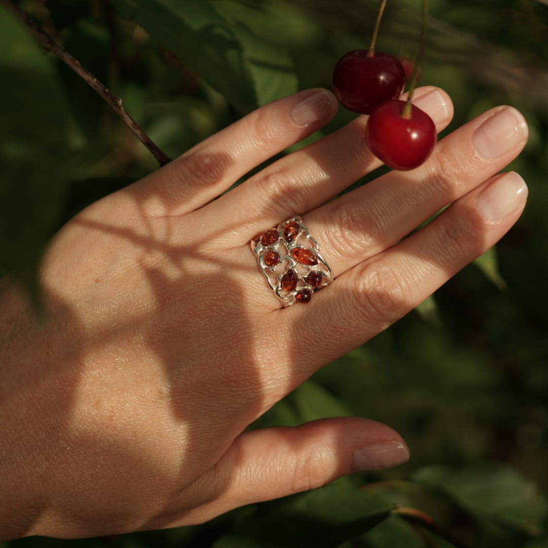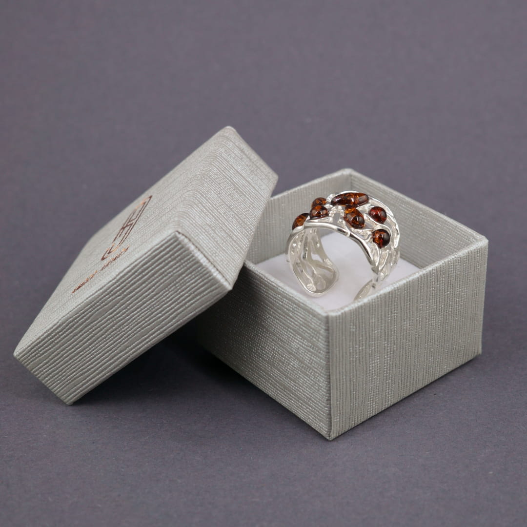 Ażurowa srebrna obrączka z bursztynem bałtyckim. Pierścionek ma możliwość regulacji rozmiaru co oznacza, że nie musisz się martwić doborem idealnego rozmiaru online. Wystarczy lekko rozszerzyć lub zacisnąć obrączkę dostosowując wielkość do grubości palca. Tolerancja rozmiaru od 13 do 17. Napisz nam w komentarzu jeki rozmiar potrzebujesz abyśmy mogli wstępnie go wyregulować.