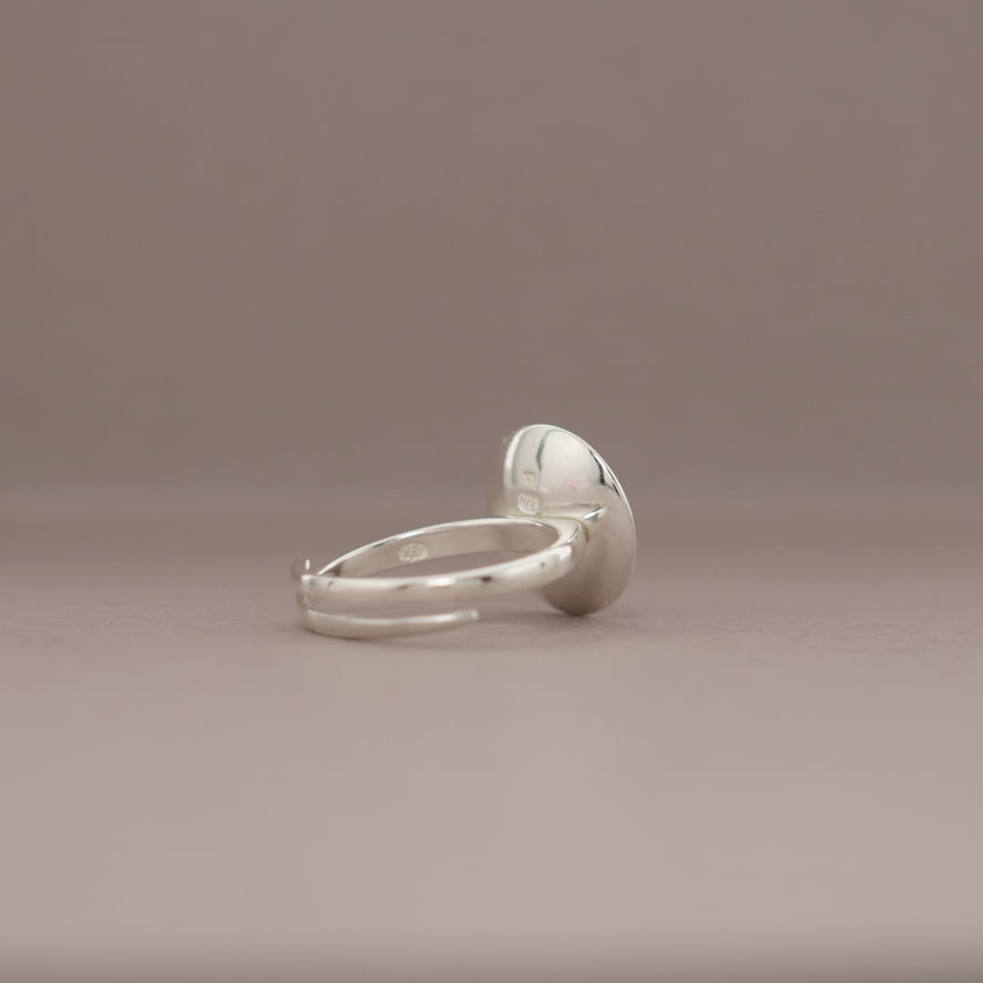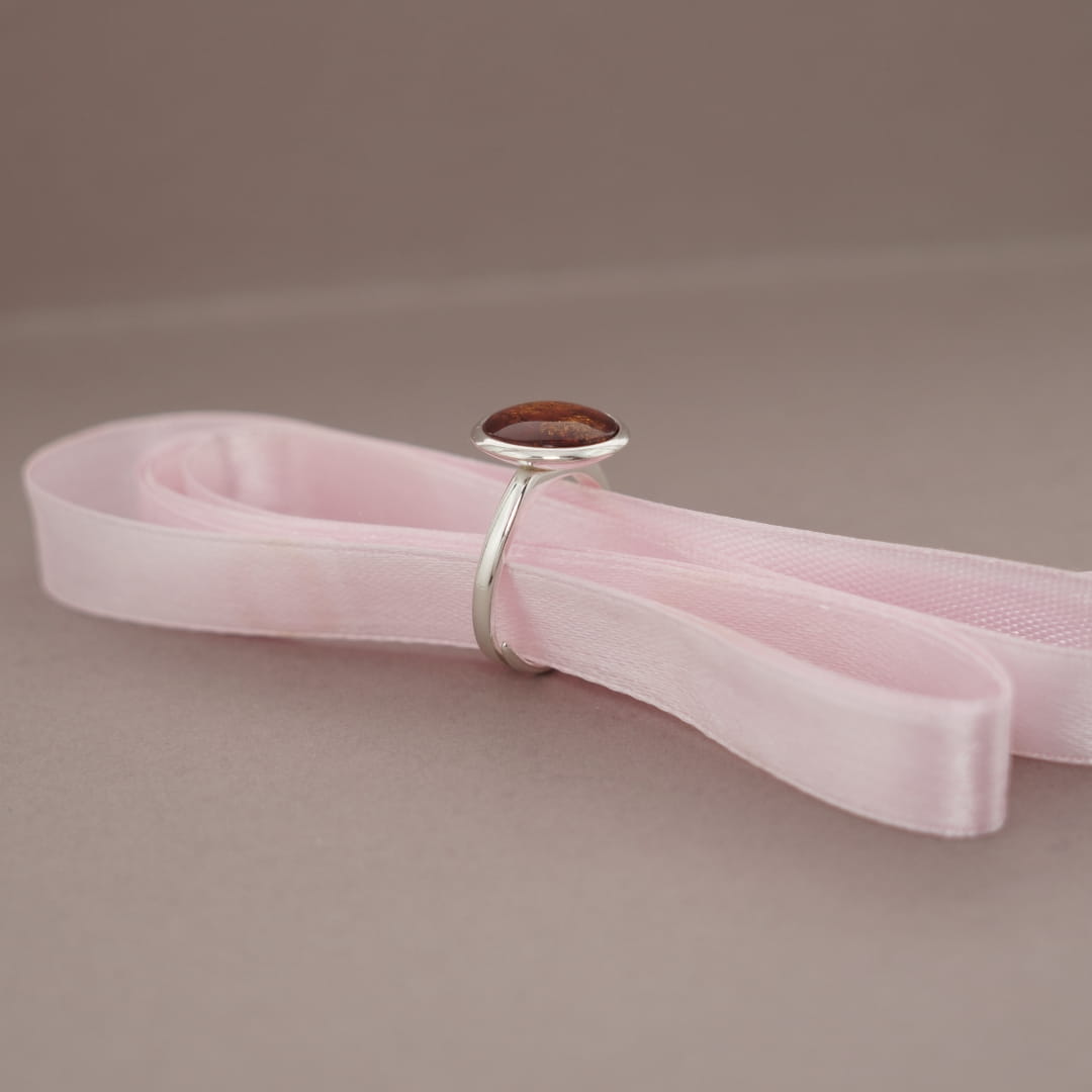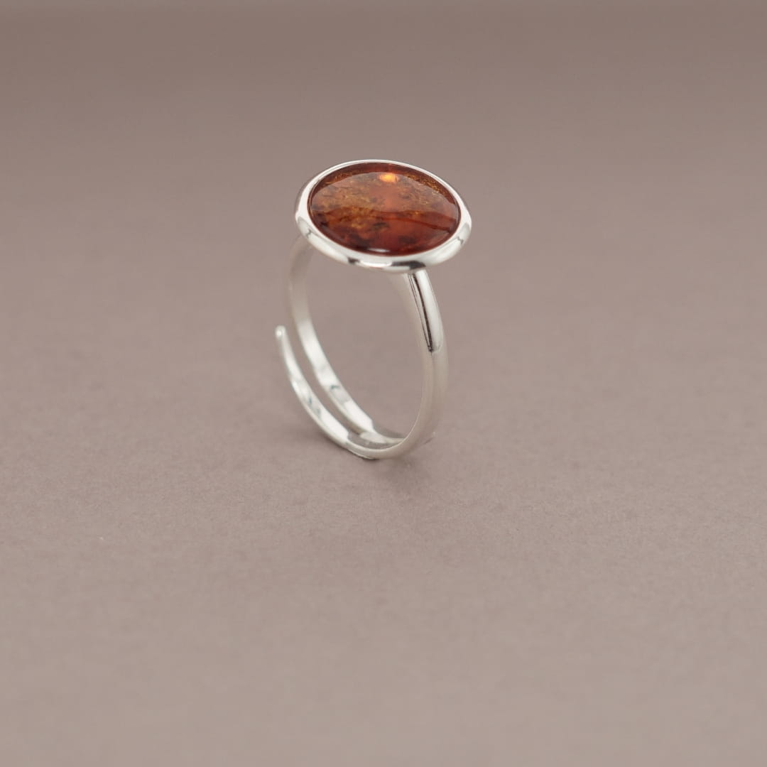 Pierścionek jest wykonany z gładkiego polerowanego srebra próby 925 oraz bursztynu bałtyckiego w kolorze tradycyjnym koniakowym. Pierścionek ma bardzo prostą, minimalistyczną formę. Bursztynowe oczko jest osadzone na srebrnej półkuli i lekko wystaje ponad obrączkę. Rozmiar pierścionka jest regulowany, obrączka dzięki specjalnemu przecięciu ma bardzo dużą tolerancję rozmiaru, który można dowolnie zmieniać.