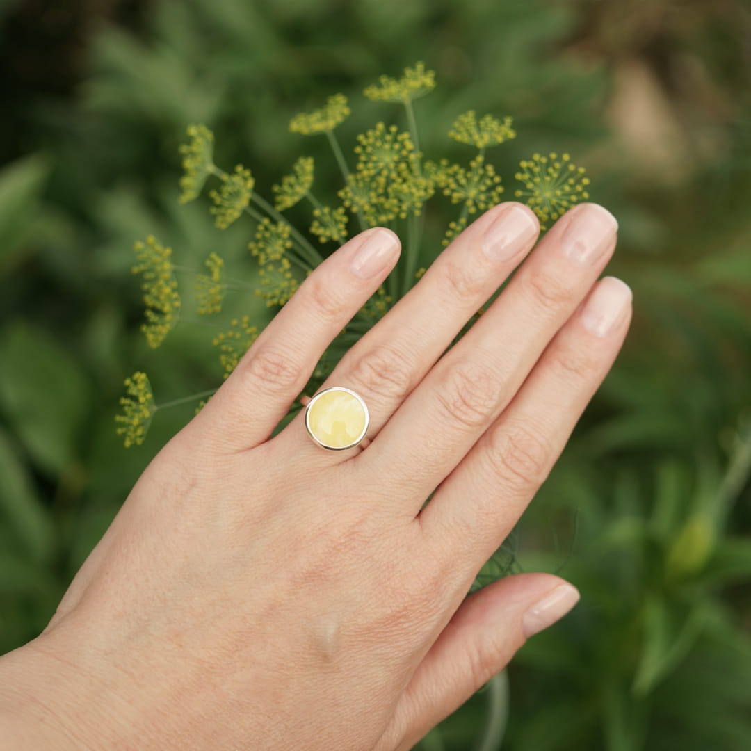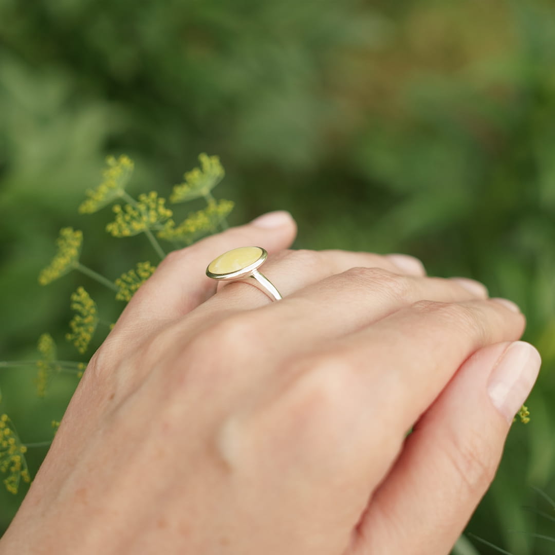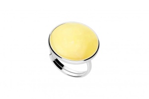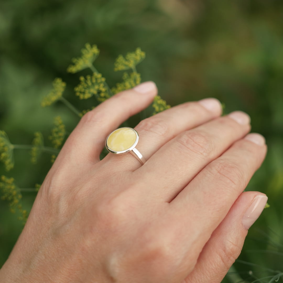 Pierścionek jest wykonany z gładkiego polerowanego srebra próby 925 oraz bursztynu bałtyckiego w kolorze mlecznym. Pierścionek ma bardzo prostą, minimalistyczną formę. Bursztynowe oczko jest osadzone na srebrnej półkuli i lekko wystaje ponad obrączkę. Rozmiar pierścionka jest regulowany, obrączka dzięki specjalnemu przecięciu ma bardzo dużą tolerancję rozmiaru, który można dowolnie zmieniać.