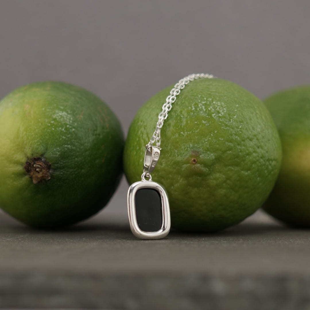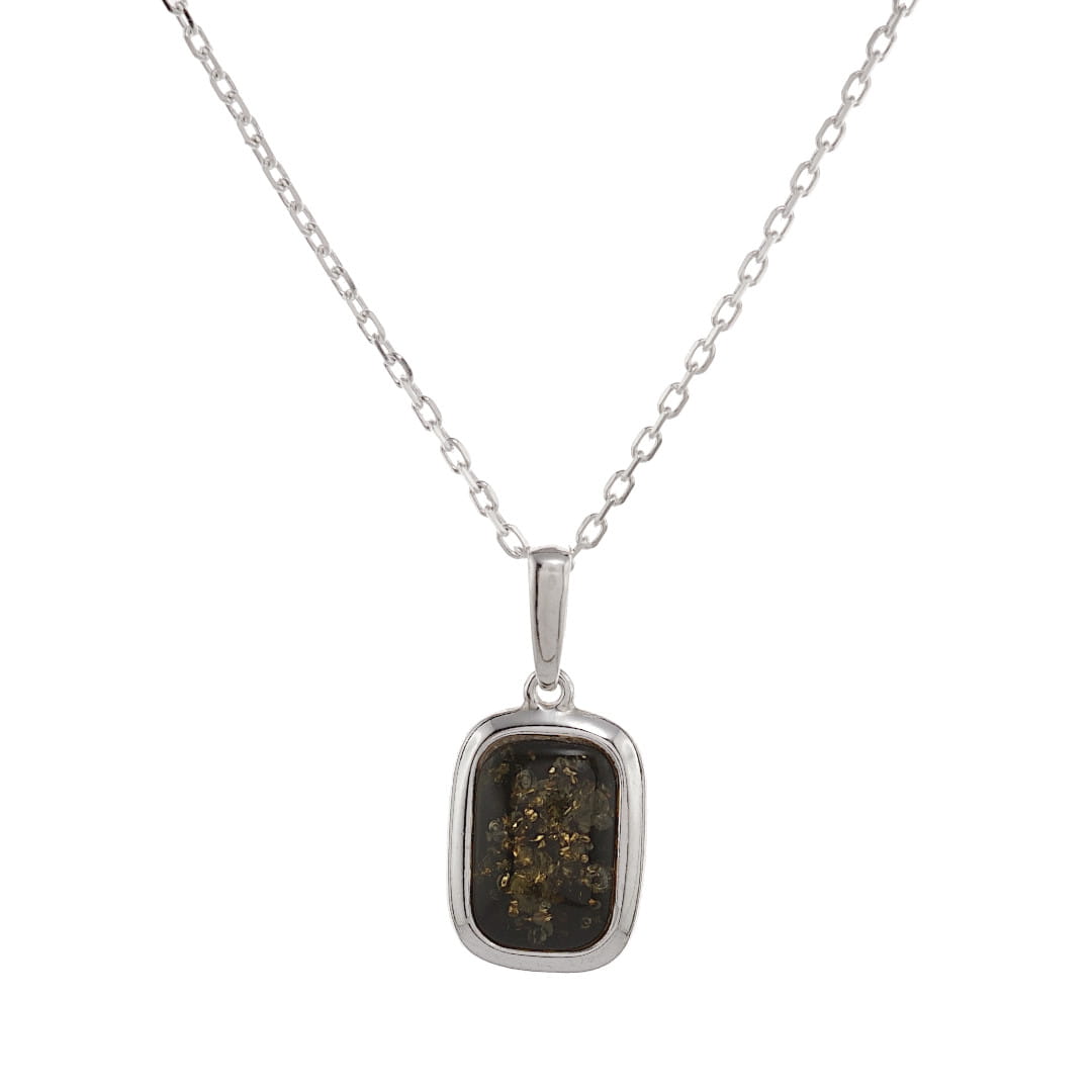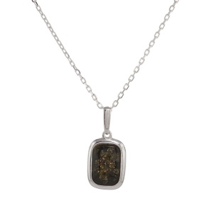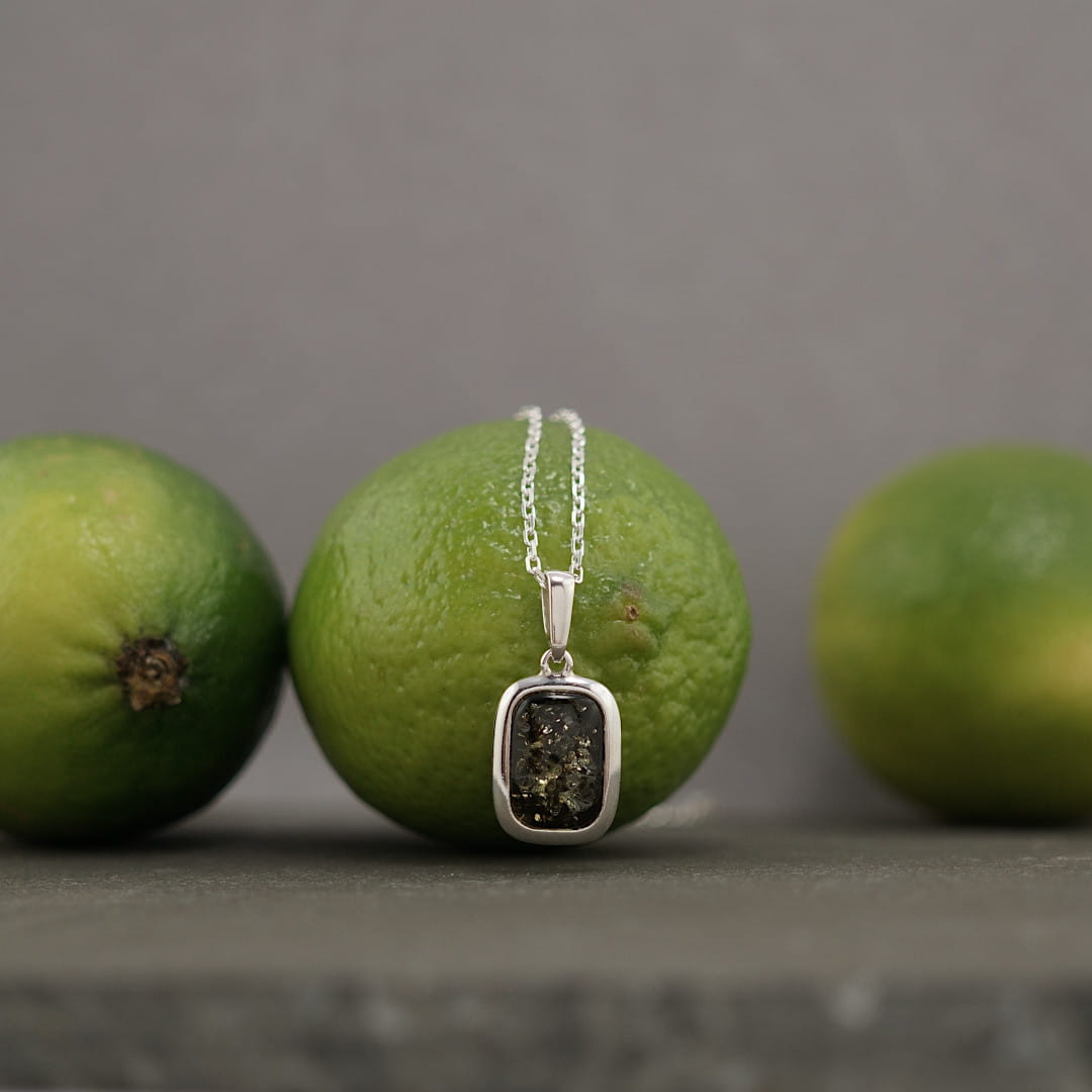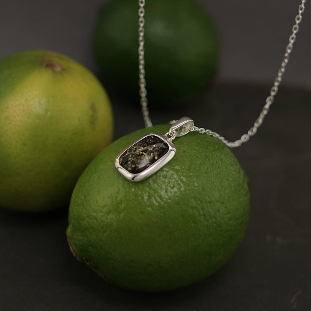 Ten wisiorek unisex, wykonany z polerowanego srebra próby 925 oraz bursztynu bałtyckiego w kolorze zielonym, wraz z łańcuszkiem o prostym, diamentowanym splocie, tworzy niezwykle efektowny, a jednocześnie minimalistyczny naszyjnik.