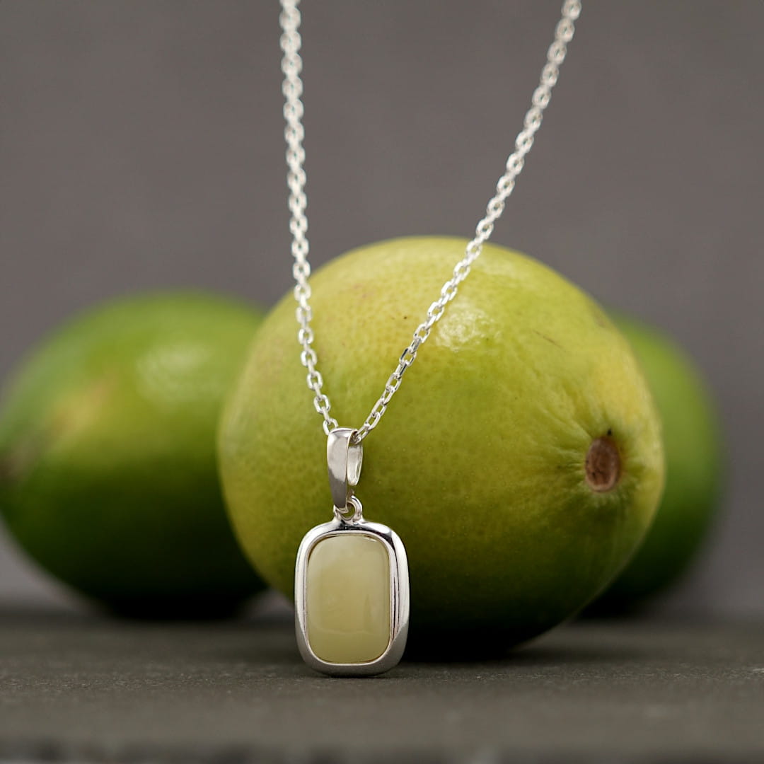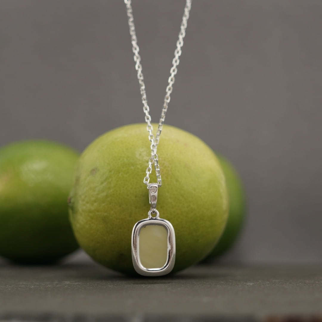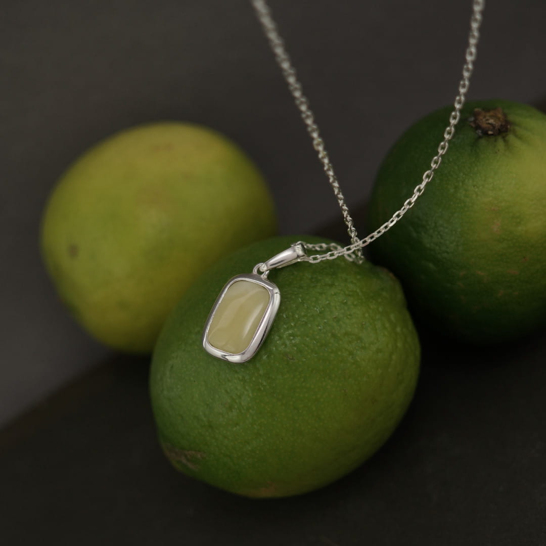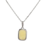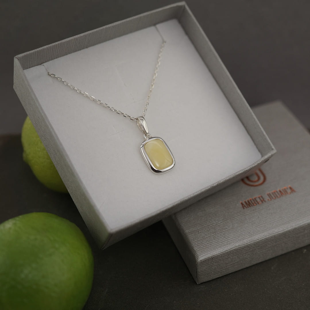 Ten wisiorek unisex, wykonany z polerowanego srebra próby 925 oraz bursztynu bałtyckiego w kolorze mlecznym, wraz z łańcuszkiem o prostym, diamentowanym splocie, tworzy niezwykle efektowny, a jednocześnie minimalistyczny naszyjnik.