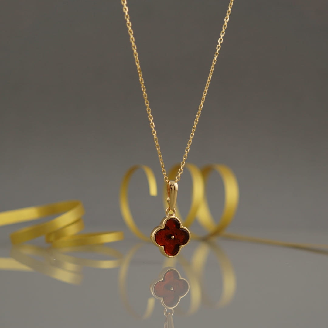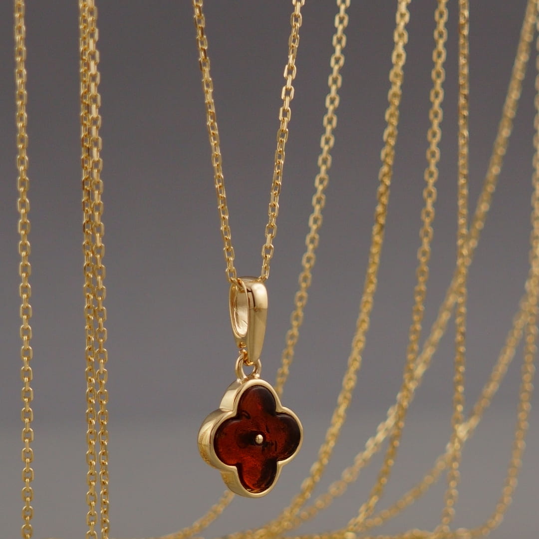 Wisiorek w kształcie kwiatka wykonany ze pozłacanego srebra próby 925 w komplecie z delikatnym łańcuszkiem. Pozłacaną oprawę wypełnia bursztyn bałtycki w tradycyjnym koniakowym kolorze. Naszyjnik jest delikatny i niezobowiązujący, będzie idealnym dodatkiem do codziennej stylizacji.